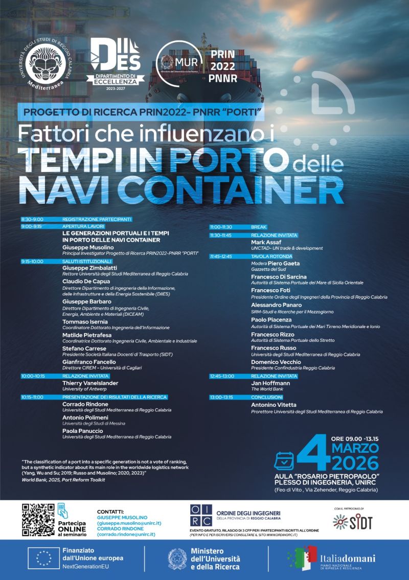 Lo scorso 4 marzo 2026 SRM ha partecipato alla giornata di lavoro “Fattori che influenzano i tempi in porto delle navi container” presso il Dipartimento di Eccellenza di Ingegneria dell’informazione, delle Infrastrutture e dell’Energia Sostenibile (DIIES) dell’Università degli Studi Mediterranea di Reggio Calabria. Il convegno ha rappresentato l'evento finale di presentazione dei risultati della ricerca, organizzato nell’ambito delle attività del Progetto di Ricerca “PRIN2022-PNRR PORTI”, finanziato dal PNRR.